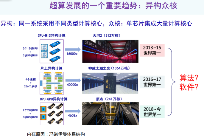 其实这与计算需求关系不大,更多的是超级计算发展本身的技术条件限制造成的。现在所有的超级计算机都是基于冯诺伊曼体系结构,冯诺伊曼体系结构的“算”-“存“分离特性会导致现有工艺下,为了满足计算需求,能够选择的设计方案十分有限。这样的系统现在越来越多,同一个系统有很多计算核心,而且计算核心还不一样,从设计算法和研究软件角度来说面临很大挑战。