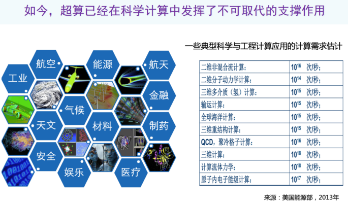 如今,历经几十年的发展,超算已经在科学计算的方方面面,例如航空、航天、气候、能源、材料、安全、天文等领域中发挥了不可取代的支撑作用。2013年美国能源部曾经统计过一些典型的科学计算应用中的计算需求,这些计算需求即便放在今天来看仍然是很大。
