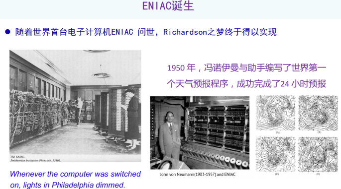 随着世界第一台电子计算机ENIAC的问世,理查德森之梦终于得以实现,ENIAC重达几十吨,占地面积非常大,并且耗电惊人。据说每当ENIAC开机的时候,整个费城的灯都暗了。1950年,冯诺伊曼和他的助手改造了ENIAC的可编程性,并在这个基础上编写了世界上第一个天气预报程序,成功完成了24小时预报,实现了理查德森之梦,也成为了科学计算的蓬勃发展的一个重要开端。