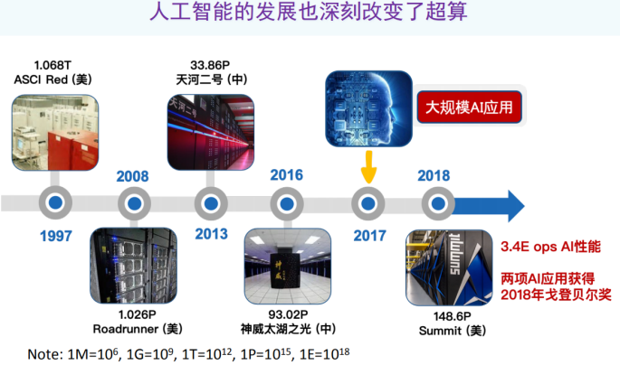 与此同时,人工智能的发展深刻改变了超算发展趋势,尤其是在2017年前后,随着大规模AI应用的涌现,新型超级计算机设计也逐渐开始考虑人工智能这类应用,最有代表性的机器就是美国的Summit,计算性能世界排名第一的系统,这台机器科学计算的双精度浮点计算性能是148Pflops/s,但是它还通过配备特殊的Tensor Core计算单元,可以实现3.4 Eops/s的AI计算性能。与此同时国际上谷歌、IBM、寒武纪、华为等大厂也都先研发了各种AI处理器。最近,谷歌Jeff Dean等人发展了采用AI设计芯片的新技术,大幅度提升芯片数据效率。毫不夸张地说,AI已经对硬件设计产生方方面面的深刻影响。