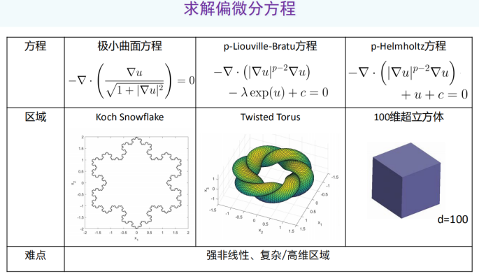 在这里,我列出了三个比较有特色的方程,它们都有强烈的非线性,并且计算区域具有不规则和高维的特点。比如第一个方程的计算区域虽然是二维,但是区域边界非常复杂。中间是三维的例子,其计算区域是一个扭曲的torus形成,采用经典方法很难准确的刻划。第三个是100维的超立方体,它高维的性质决定了经典的方法很难去求解。