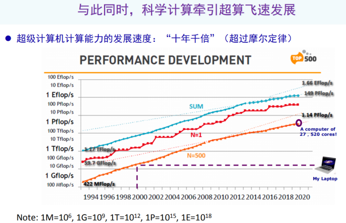 在科学计算巨大需求的牵引之下,超级计算机的计算性能按照“十年千倍”的速度迅猛攀升。我们都知道摩尔定律,摩尔定律的是说个人计算机的性能提升速度是每18到24个月性能翻一番,而超级计算机可以达到每年性能翻一番,“十年千倍”的发展速度。