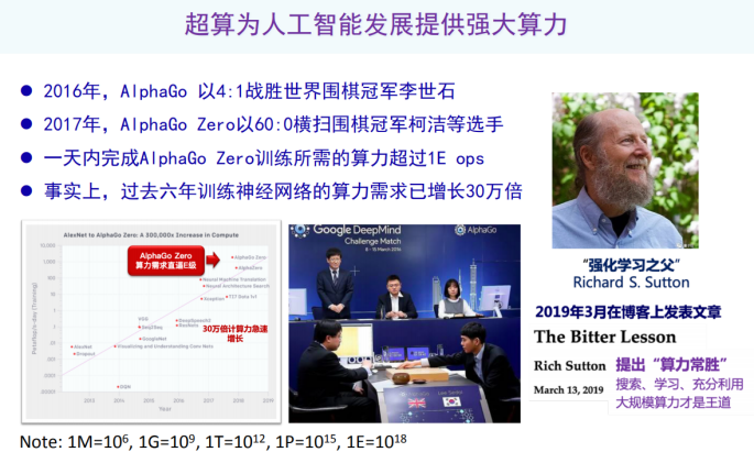 AlphaGo和AlphaGo Zero作为人工智能最近几年非常著名的突破,先后打败了人类的围棋冠军。像AlphaGo Zero这种大型的AI应用,如果想一天之内完成它的训练,我们所需要的计算能力已经超过1E ops,事实上过去6年训练神经网络的算力需求已经增长了30万倍,这远远超出超级计算机“十年千倍”的计算性能提升速度。所以现在有观点认为计算能力是人工智能发展的非常重要的基础,甚至有人认为算力常胜。