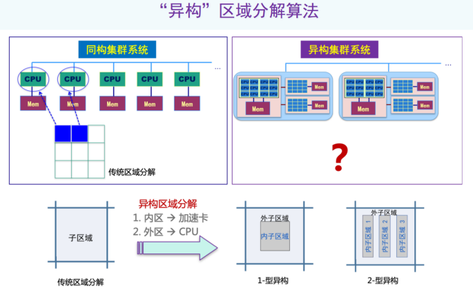 对此,我们提出了一套异构区域分解算法,在传统的区域分解思想基础上,对每个子区域进行第二次切分,切分时排除掉之前理论上的假定,包括凸区域、单联通区域之类的约束,目标就是要与现有的异构系统硬件配置相适配。
