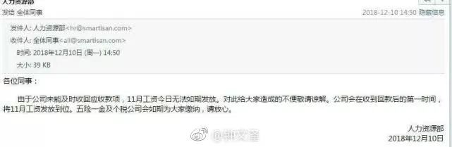 12月10日的时候,在很多公司发放工资的时候,一个关于锤子科技无法如期发放11月份工资的内部邮件截图在很多社群中传播开来。