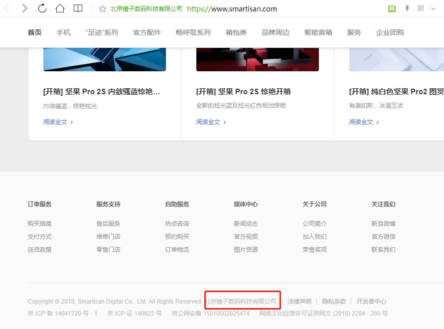 从锤子手机官网的底部我们就能发现,这个官网备注的企业就是北京锤子数码科技有限公司。因此,当这家公司发生巨大的工商变化的时候,大家都直呼锤子要变天了。