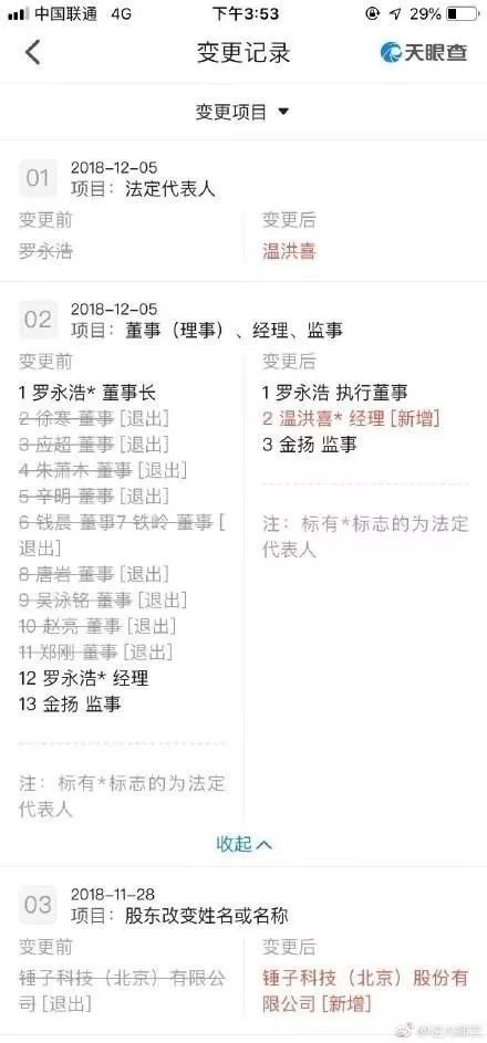根据知名企业工商信息查询工具天眼查的爆料显示:12月5日,北京锤子数码科技有限公司在工商上做出了重大变更,该工商原法定代表人罗永浩的法人身份被温洪喜取代,朱萧木、钱晨、徐航、唐岩等名字也从董事会移除。