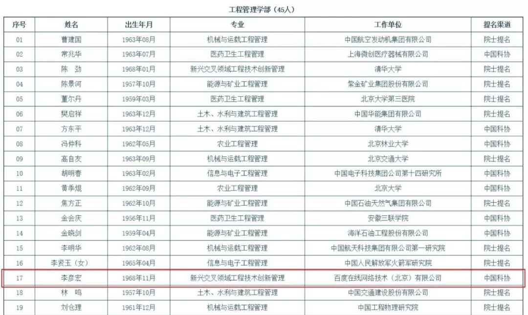 4 月 30 日,中国工程院官网发布 2019 年院士增选有效候选人名单,百度 CEO 李彦宏上榜,引发热议。