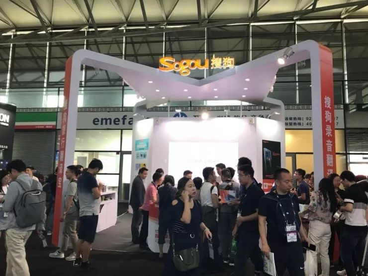 展会开始后,许多人被展厅入口处的展台吸引了目光:以白色为主基调、亮橘色为点缀色的搜狗展台,在诸多深色展台中间格外显眼,也为展会增添了些许活力气息。