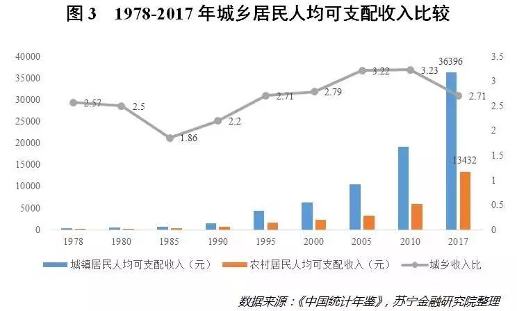 不过,从城乡居民收入比来看,在经历了长期的攀升后,近些年开始有下降的趋势,2017年为2.71,这比2010年的3.23低了不少。这说明城乡居民收入的绝对差值虽然在增大,但相对差值却有所缓和。