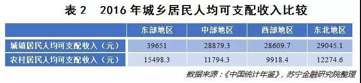 从东、中、西部及东北地区的城乡居民收入水平比较来看,东部地区的居民收入水平大幅度高于中西部和东北地区。2016年的数据显示,从城镇居民人均可支配收入层面看,东部地区是西部地区的1.39倍;从农村居民人均可支配收入层面看,东部地区是西部地区的1.56倍。倘若对比东部城镇居民与西部农村居民的人均可支配收入,那么差距无疑是更大的,前者是后者的将近4倍(参见表2)。