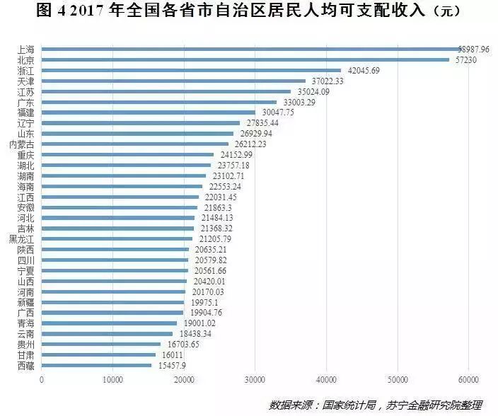 国家统计局数据显示,2017年全国各地区居民人均可支配收入最高的前5个省市分别为上海、北京、浙江、天津和江苏,而最低的5个省市分别为西藏、甘肃、贵州、云南和青海。其中,人均可支配收入最高的上海为58987.96元,最低的西藏仅为15457.9元,仅比上海的四分之一略高,收入差距可见一斑(参见图4)。