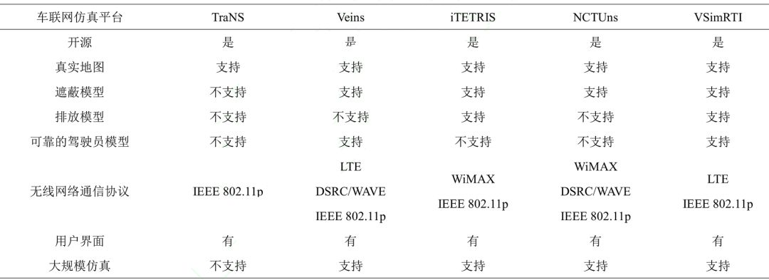 表 1 典型车联网仿真平台比较