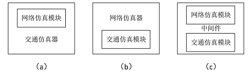 嵌入式车联网仿真平台是指利用现有的网络仿真器、交通仿真器或者中间件,嵌入所需要的相应模块以构建完整的车联网仿真平台,主要有三种嵌入方案,如图 2 所示。