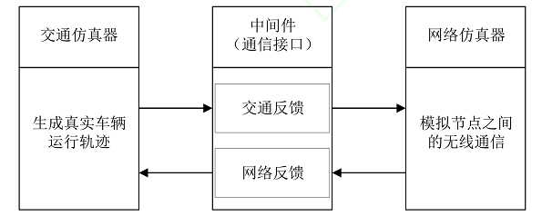 联合式车联网仿真平台是指充分利用现有的网络仿真器与交通仿真器,将其进行双向链接,利用中间件进行信息的交互,如图 3 所示。