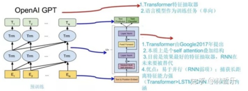 GPT只用了transformer的decoder模块提取特征,而不是Bi-LSTM;堆叠12个