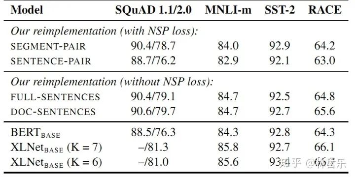 SEGMENT-PAIR + NSP:输入包含两部分,每个部分是来自同一文档或者不同文档的 segment (segment 是连续的多个句子),这两个segment 的token总数少于 512 。预训练包含 MLM 任务和 NSP 任务。这是原始 BERT 的做法。