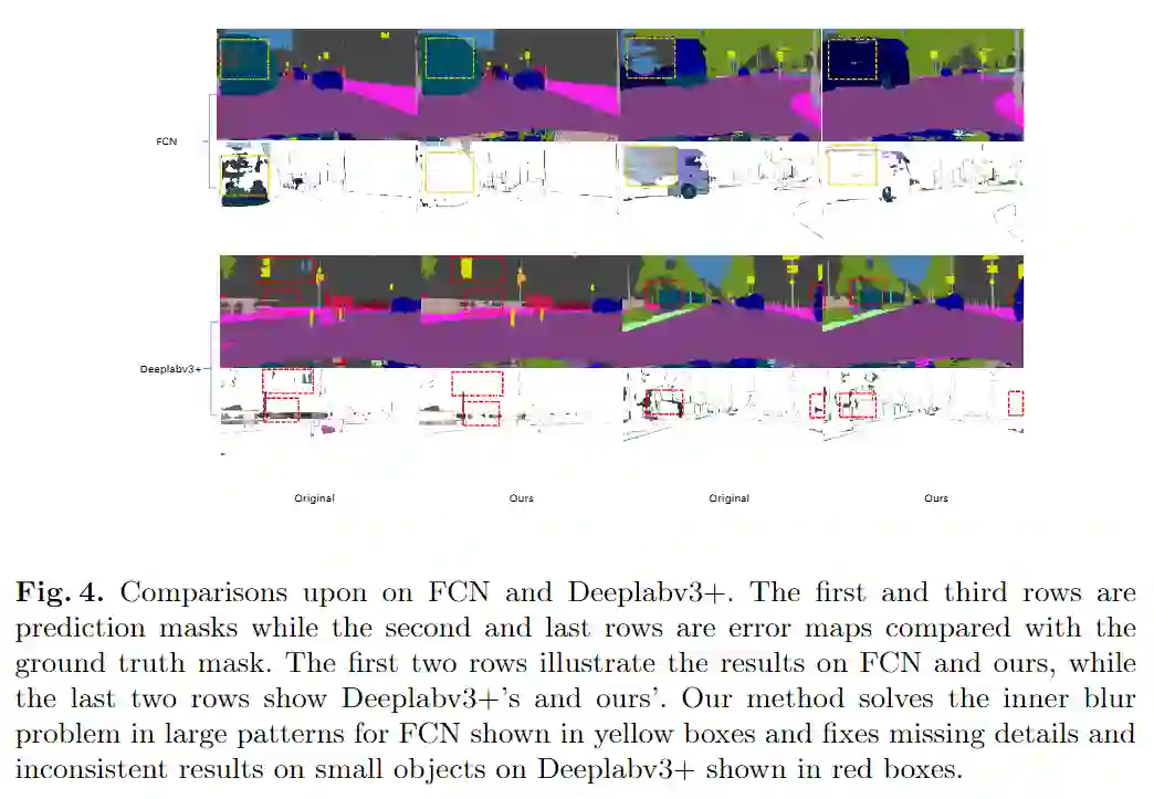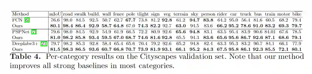 此外,所提出的框架是轻量级的,可以插入基于最新的FCN 的分割网络中以提高其性能。该方法在四个驾驶场景数据集包括Cityscapes ,CamVid ,KITTI 和BDD 上均取得了最佳性能。特别是,该方法在仅带有精细标注数据的Cityscapes数据集上实现了83.7 mIoU。