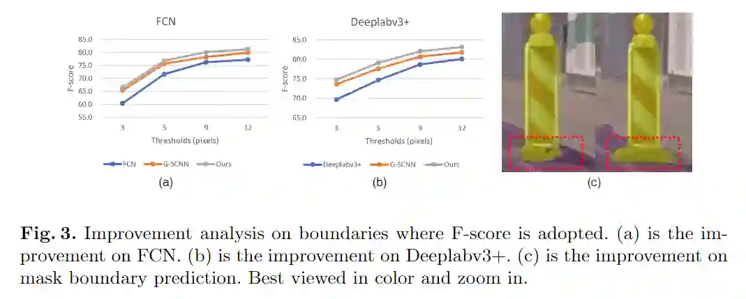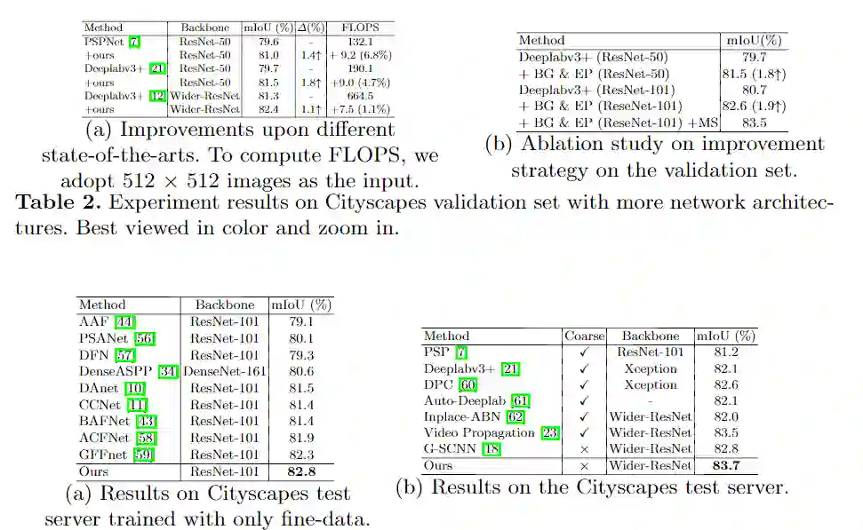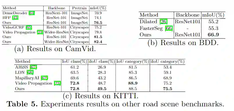 通过实验表明,论文所提出的具有各种基准或主干网络的框架可有更好的目标对象内部一致性和目标对象边界。在包括Cityscapes、CamVid、KIITI和BDD在内的四个主要道路场景语义分割数据集上进行的大量实验表明,本文提出的方法实现了SOTA,同时保持了较高的推理效率。特别是,本文的方法仅使用精细标注的数据就可以在Cityscapes数据集上达到83.7 mIoU。