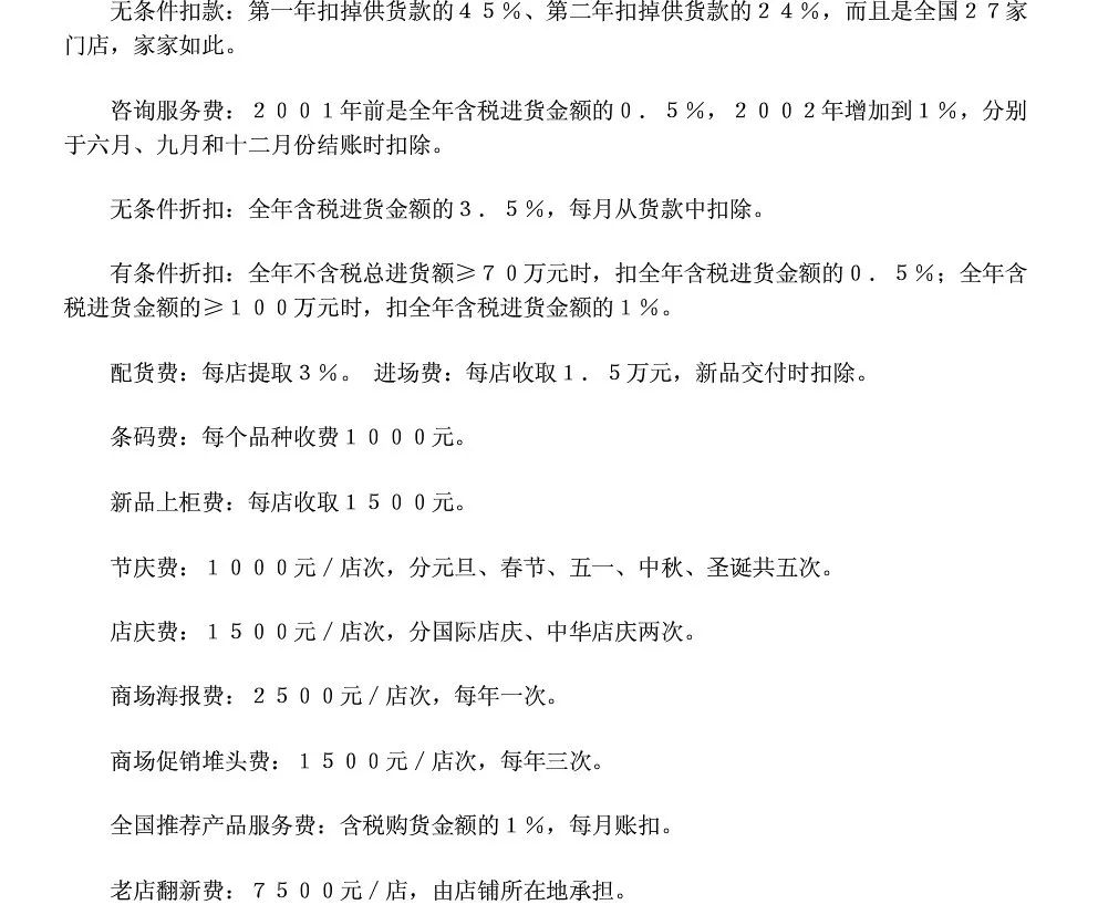 根据媒体公开报道,家乐福收费名目之繁多,让供应商深感恐惧和心惊肉跳,包括咨询服务、配货、条码、新品上柜等近20种费用(详细见图片)。