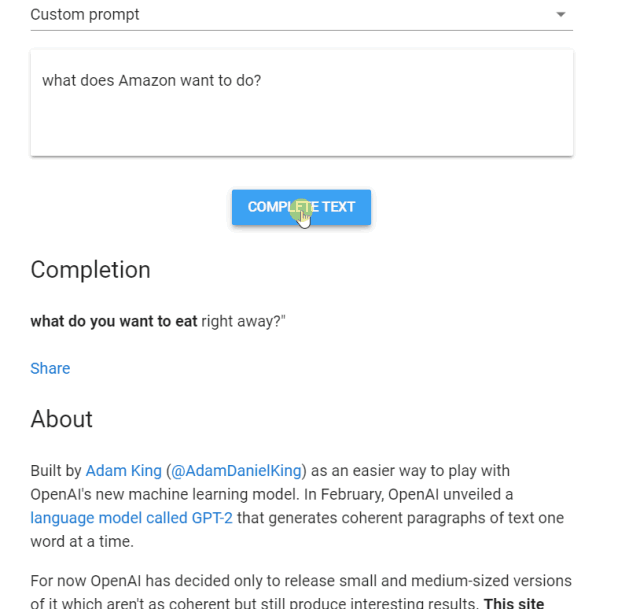 Adam King利用GPT-2做成的应用网站。输入为“what does Amazon want to do”(ps:实际转化速度较慢,动画为删减绝大部分重复帧之后的效果)。网站地址:https://talktotransformer.com/