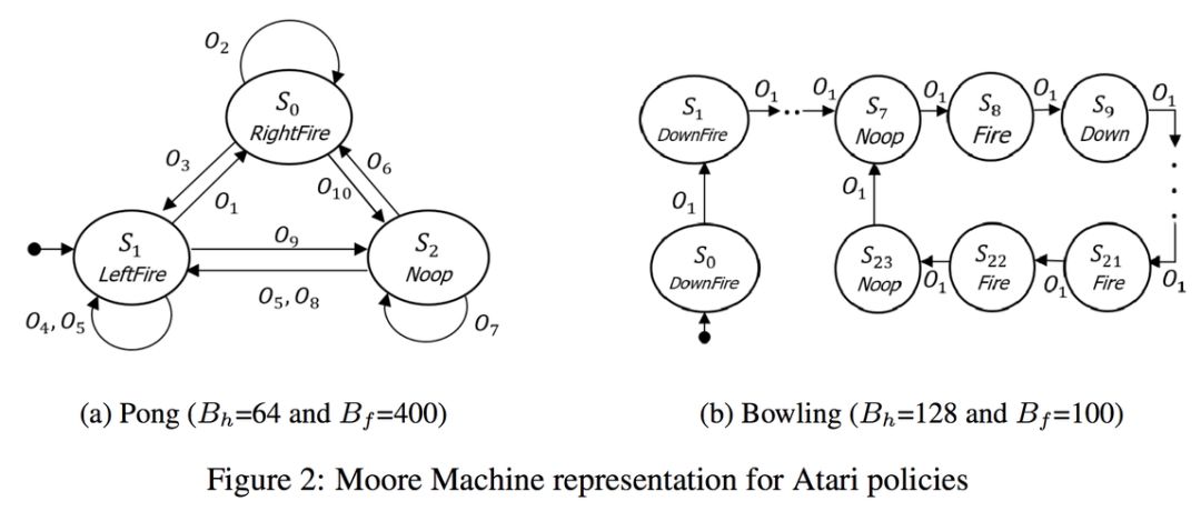 两篇论文的主要动机是,因为RNN中的隐藏态空间很大,是否有可能把状态数量减少到有限的数量?我质疑DFA是否能够有效地在语言中代表RNN,但我很喜欢在训练阶段学习RNN,然后把它转换到DFA进行推理的想法,如同 Koul等人的论文所示。结果得到的有限表征在游戏Pong中只需要3个离散记忆状态和10个观察状态,它也能帮助解释RNN。