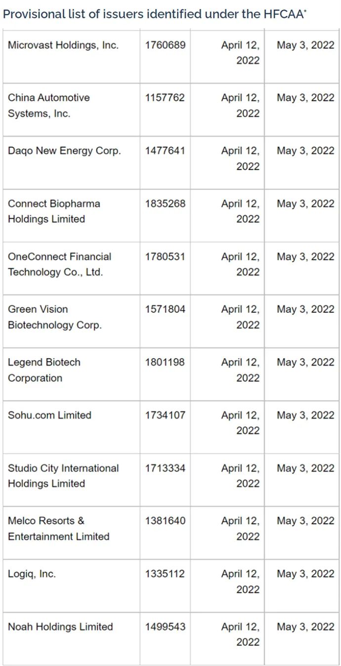 这已经是 3 月以来第四批被纳入「预摘牌名单」的中概股企业。前三批被列入名单的企业具体如下: