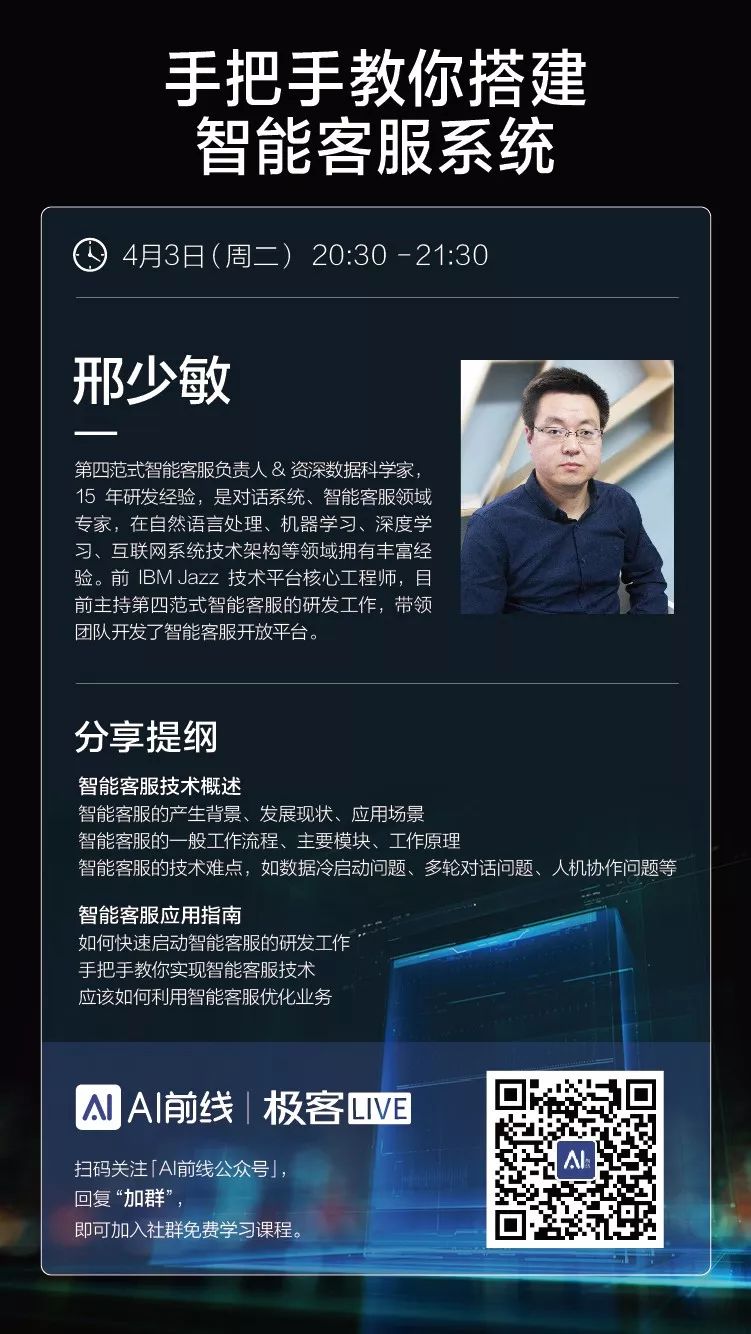 讲师介绍: 邢少敏,第四范式智能客服负责人 & 资深数据科学家,毕业于北京航空航天大学,获博士学位。15 年研发经验,对话系统、智能客服领域专家,在自然语言处理、机器学习、深度学习、互联网系统技术架构等领域拥有丰富经验。前 IBM 资深工程师,IBM Jazz 技术平台核心工程师。前环信智能客服技术负责人,从 0 开始带领团队研发了环信智能客服系统。目前主持第四范式智能客服的研发工作,带领团队开发了智能客服开放平台。