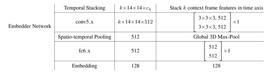 关于Encoder,使用的是VGG-M/ResNet50。而Embedding Network结构如下,加入3D卷积和3D池化,在补充材料中作者说到,即使在 k=2 情况下,性能也较好。