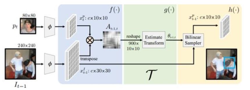 首先我们来看可微分tracking operation,简单的patch matching过程。如下图所示,1) 首先对当前帧需要跟踪的patch和上一帧,提取下采样8倍的Mid-level feature,进行L2正规化,通过点乘计算Affinity矩阵后Softmax;2)接着通过两个卷积层和一个全连接层,定位出仿射变换的三个参数,2D平移和旋转;3)最后进行双线性sample,得到匹配后区域的特征。