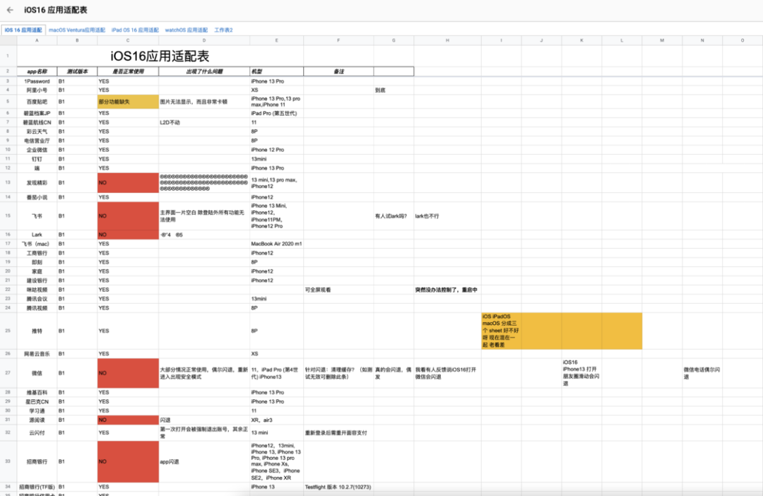 很多喜欢尝鲜的朋友在更新到 iOS 16、iPadOS 16、watchOS 9 和 macOS Ventura 新系统后,发现一些 App 无法正常使用,如果你也想更新到第一个开发者测试版,但又担心自己常用的 App 会受到影响,那么可以看看下面这个由网友们发起的
