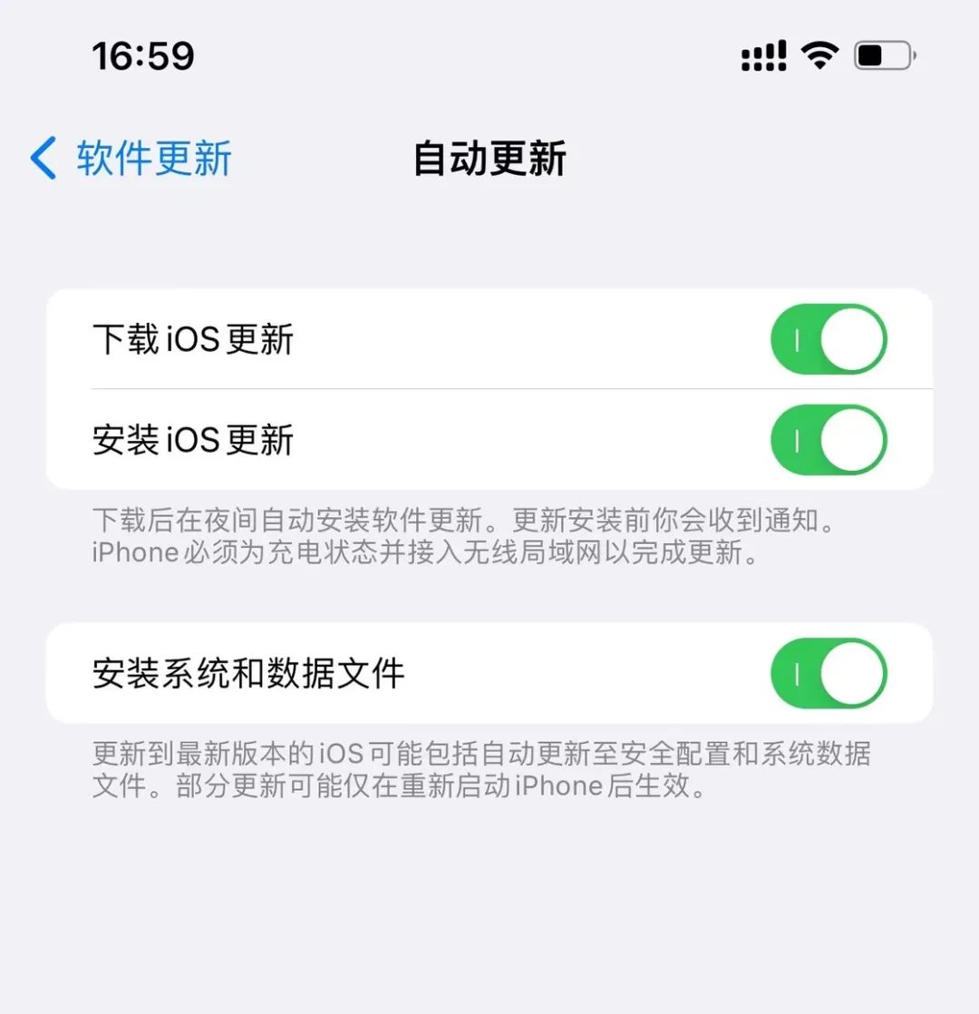 不过,这个新特性没有默认启用,用户需要在「设置」>「通用」>「软件更新」>「自动更新」中启用「安装系统和数据文件」的选项。