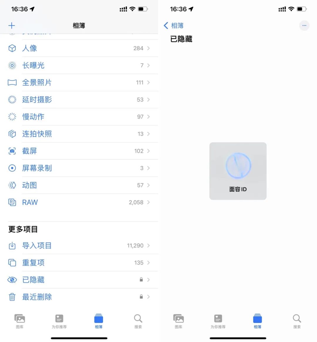 终于,一直以安全性标榜自己的 Apple 想起来了为隐藏相册和最近删除相册加上了密码锁的功能。在这两个相册的右边,我们可以看到一个锁的图标,点击后需要通过 Face ID 或者 Touch ID 验证才可以打开相册。