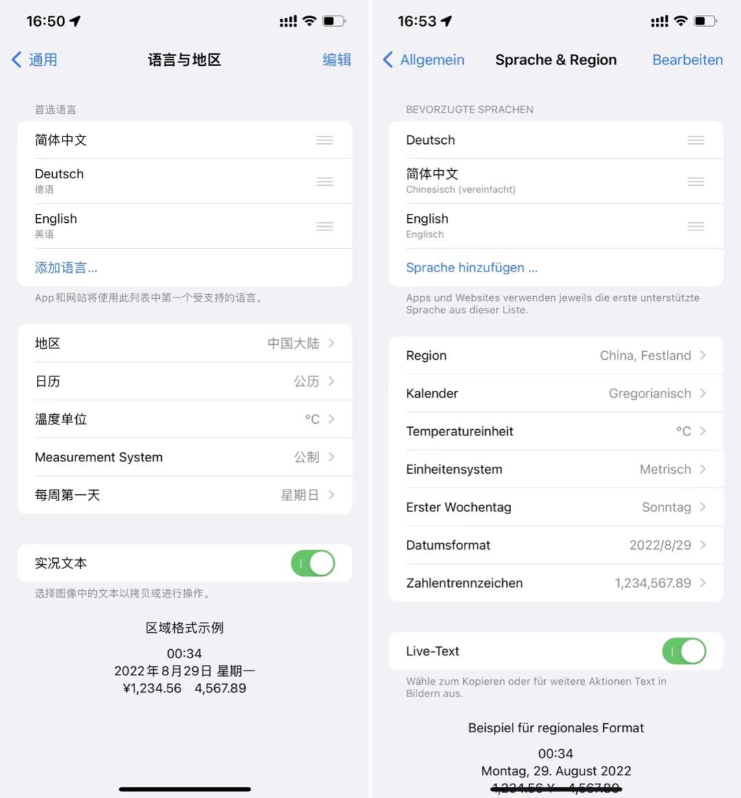 在 iOS 16 中,我们可以为系统设置多种计量单位,比如说历法、温度单位、度量系统、每周第一天、日期格式、数字分隔符等。如果你想要更改,通过「设置」>「通用」>「语言与地区」就可以看到这些计量单位的设置选项。