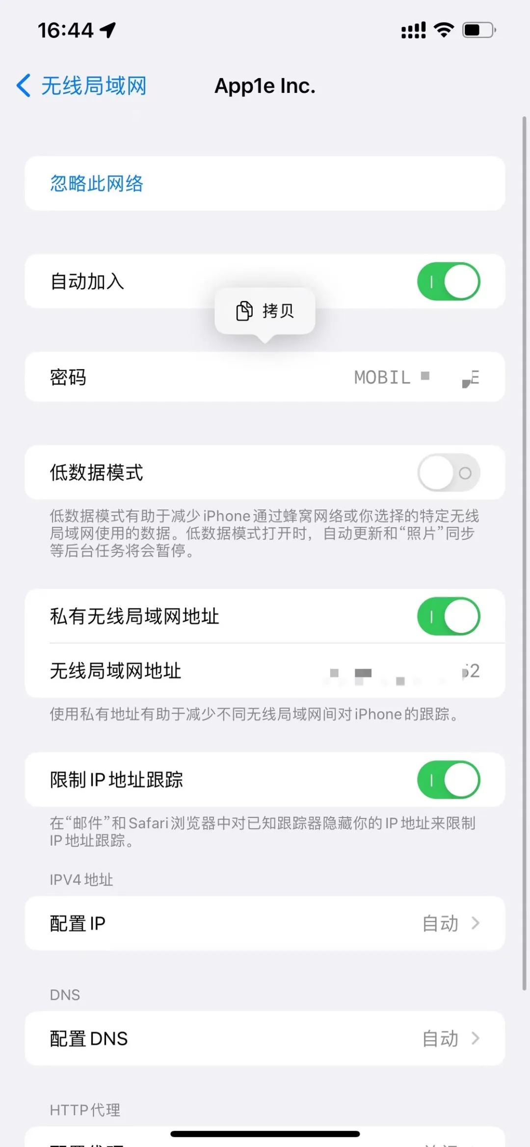 不知道是出于什么考虑,先前 iPhone 上已经连接的 Wi-Fi 也无法查看密码,这一窘境在 iOS 16 中得到了解决。点击已连接 Wi-Fi 右侧的详情按钮,然后单击密码一栏,就会弹出 Face ID 或者 Touch ID 的验证窗口,验证通过后我们就可以在密码一栏看到明文的密码了。如果你想要复制 Wi-Fi 密码,只需要长按显示出的密码,就会弹出复制的按钮。