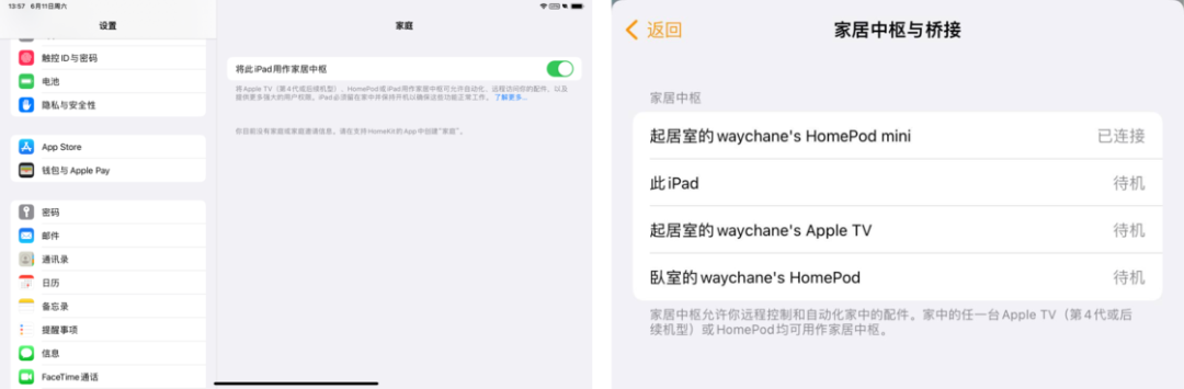 不过,根据我们的测试,目前 iPad 更新到 iPadOS 16 的第一个测试版本后,设置中依然有「将此 iPad 用作家居中枢」的选项,勾选之后在家庭 App 中也能看到 iPad 作为家庭中枢显示了出来。