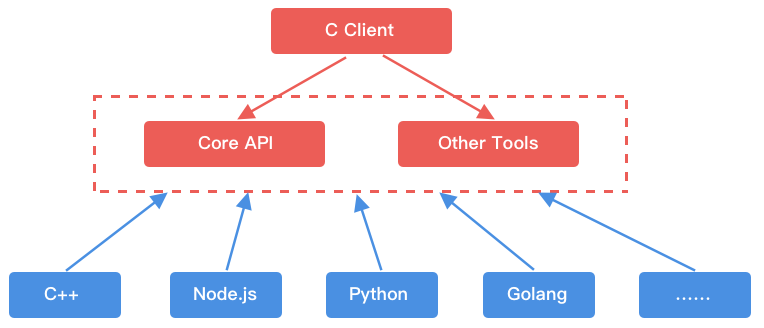 随着业务的不断发展,很多产品和应用需要使用不同的语言,CAT 多语言客户端需求日益增多,除 Java 客户端外,目前提供了 C/C++、Python、Node.js、Golang 客户端,基本覆盖了主流的开发语言。对于多语言客户端,核心设计目标是利用 C 客户端提供核心 API 接口作为底层基石,封装其他语言 SDK。