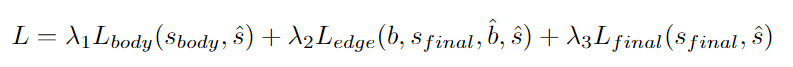 因为每个部分都有特定的目的。特别是,可以为body和edge附加辅助监督损失。对于边缘保留模块,预测了训练过程中的边界映射,它是图像中对象和填充类的所有轮廓的二进制表示。总损失函数是计算如下: