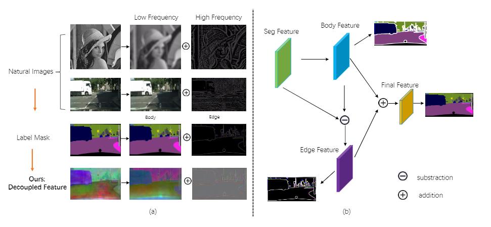 另一方面,人类通过感知物体主体和边缘信息来区分物体是很自然的。受此启发,本文以明确的方式探索主体和边缘之间的关系,以获得最终的语义分割结果。如图1(a)前两行所示,一个自然的图像可以分解为一个低空间频率分量,它描述了平滑变化的结构,以及一个高空间频率分量,它描述了快速变化的结构。首先应用均值或高斯滤波器进行平滑处理,其余高频部分可通过减法获得。同样的,分割mask也可以用这种方式解耦,其中细微细节的边缘部分可以通过减法从主体部分获得。 受这一结论的启发,假设用于语义分割的特征图也可以解耦为两个部分:主体特征和边缘特征(见图1(b))。前者包含了物体内部低频的平滑表示,而后者则有高频的sharper细节信息。