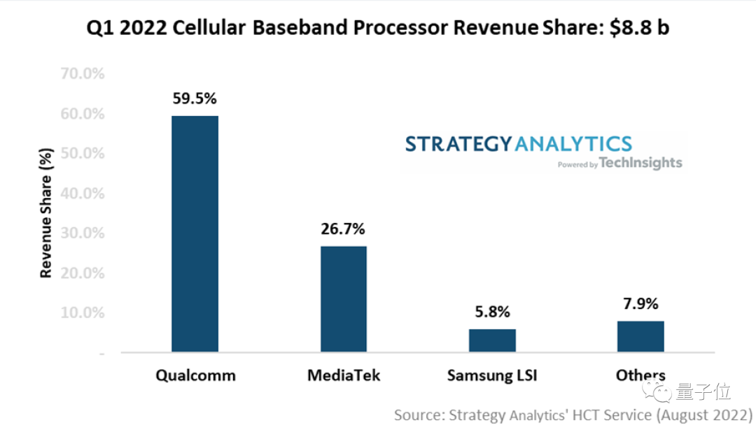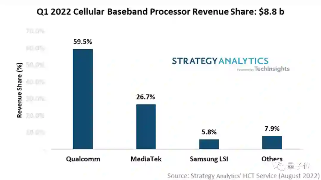 随后,5G等通信技术开始取得进一步发展,高通也凭借通信技术再次成为5G时代的弄潮儿。2022年Q1,高通以59.5%的营收份额继续蝉联基带芯片市场份额第一。