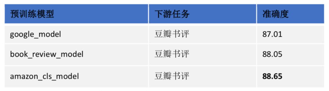 上面的模型只是在小规模语料上训练的结果。我们可以从 UER 的模型仓库中去搜索更加合适的预训练模型。Amazon_cls_model.bin 使用分类目标任务和 Amazon 评论语料 [10] 进行预训练。由于这个模型的语料和书评语料性质接近,并利用了有监督信息 [3],所以这份预训练模型可能对于书评数据集是一个很好的选择。