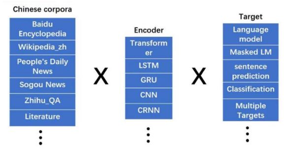 ▲ 图3. 不同语料、编码器、目标任务进行组合,得到不同性质的预训练模型