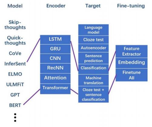 ▲ 图1. 预训练模型和它们使用的模块。BERT模型使用12层Transformer编码器,遮罩语言模型+下一句子预测作为目标任务,并将整个模型迁移到下游任务进行微调
