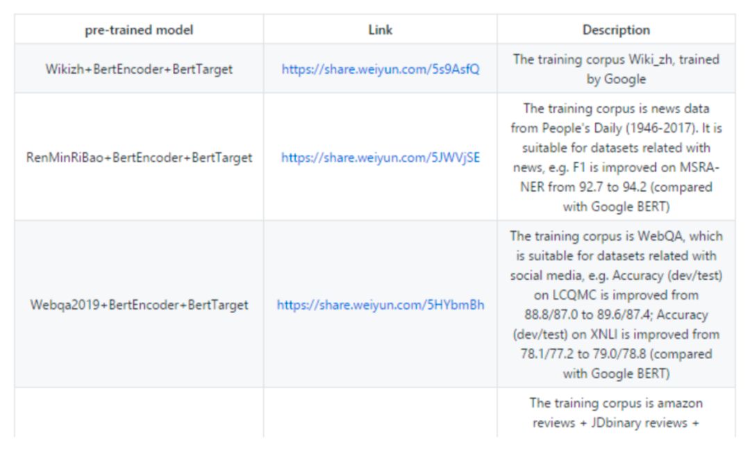 图 3 给出了我们已有的语料、编码器、目标任务的组合。图 4 给出了项目中预训练模型下载链接和描述的截图。