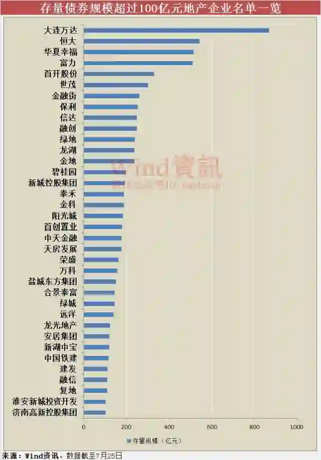Wind资讯统计显示,目前存量债券规模超过100亿元的房企数量已达36家,万达以超过800亿规模位居第一。