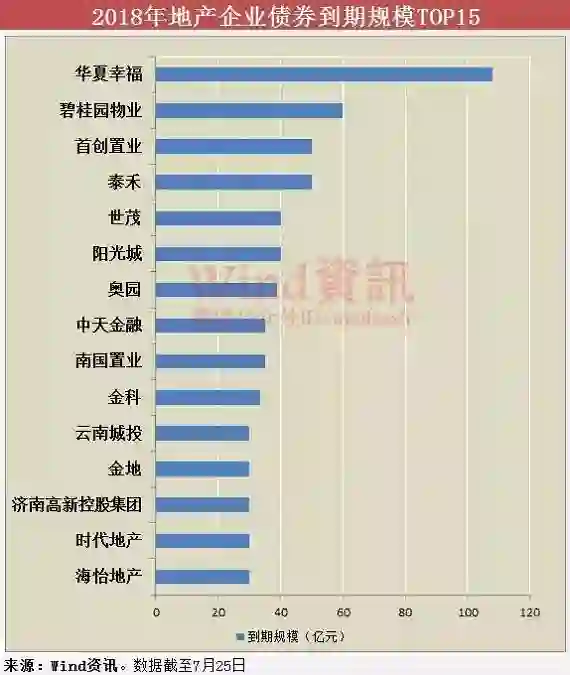 数据显示,2018年,存量债券到期规模前15位的地产企业,合计债券到期规模640.5亿元,约占当年地产企业债券到期规模的30.9%。其中,