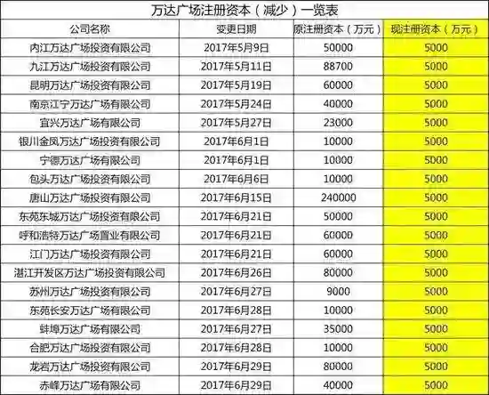 从2017年5月9日到2017年6月29日,在两个月时间内,万达商业至少将20家万达广场有限公司的注册资本均减少,而且都是减至清一色的0.5亿元。