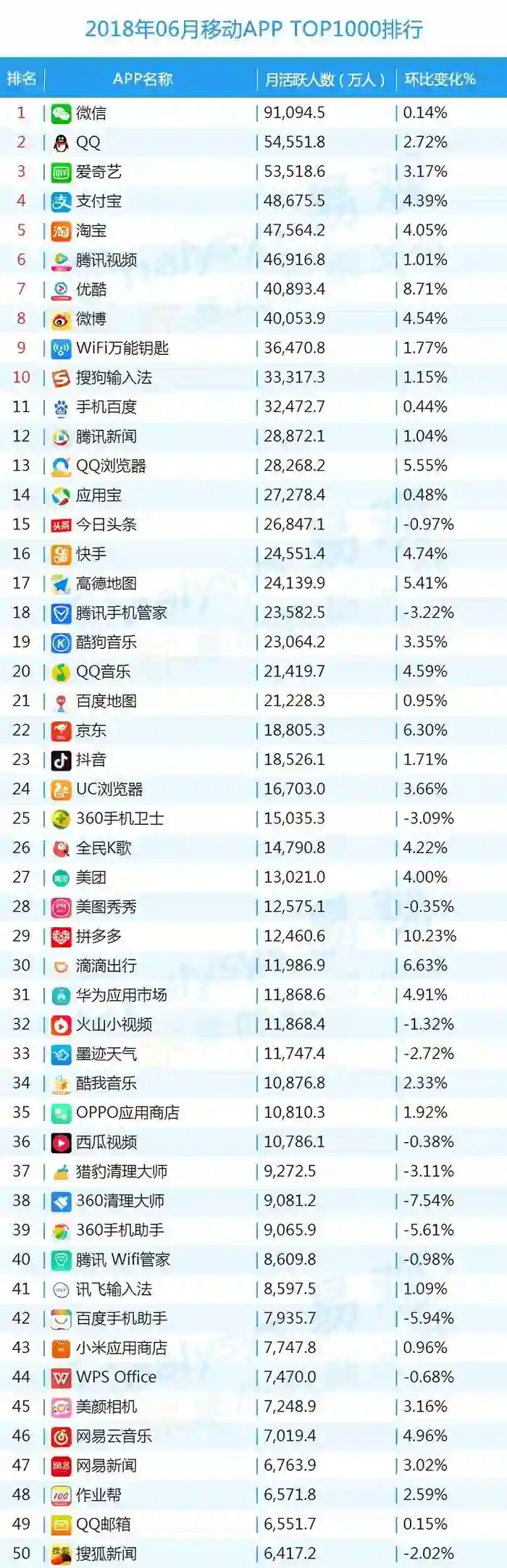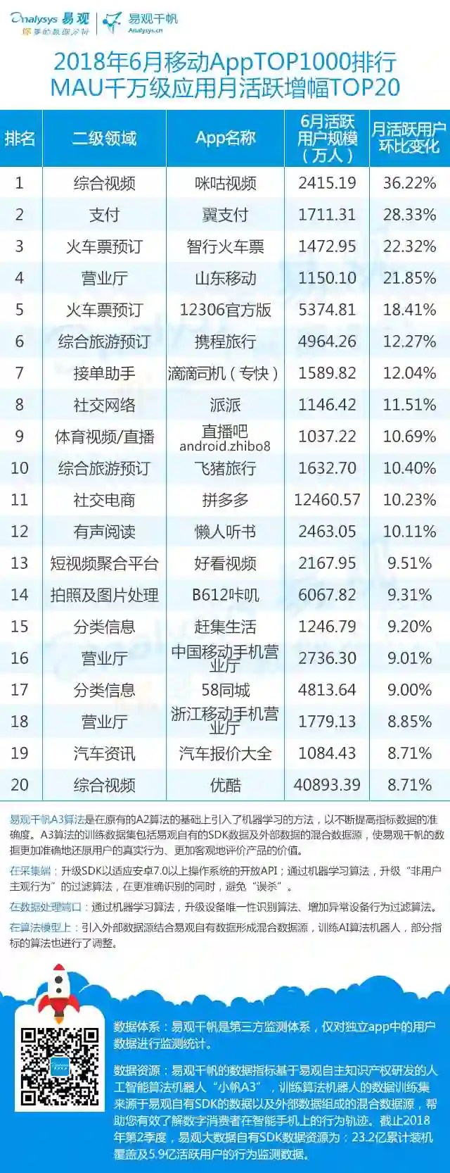 ▌MAU超千万增幅TOP20:暑期+世界杯激活旅游出行市场 大体量拼多多继续保持高速增长