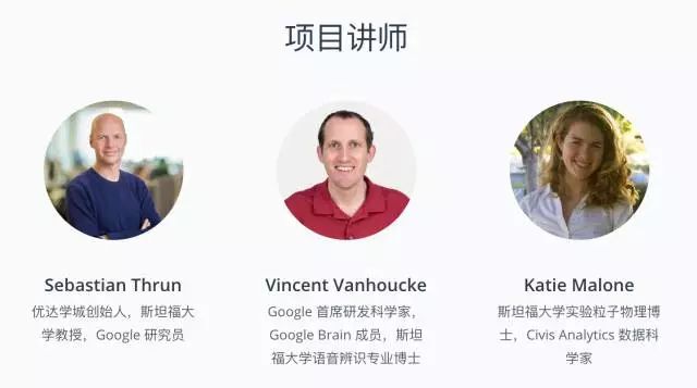 豪华讲师阵容在线教学。无人车之父 Sebastian Thrun 和 Google 一线科学家、斯坦福大学博士亲授。