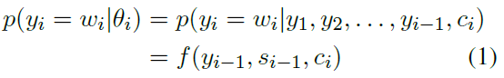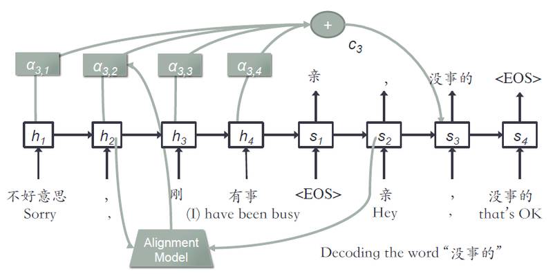其中加了 context 向量,他是由图中的 α 求得的,α 表示的是当前步的输入单词,和上一步的生成单词之间的匹配度,用了一个 alignment 模型计算。